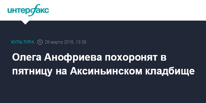 Москва. 29 марта. INTERFAX.RU - Народного артиста России Олега Анофриева, скончавшегося накануне, похоронят в пятницу, 30 марта, на Аксиньинском кладбище в Одинцовском районе Подмосковья, сообщили "Интерфаксу" в Гильдии актеров кино.