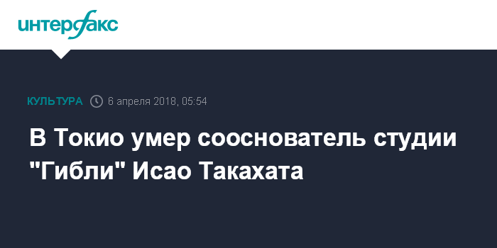 Москва. 6 апреля. INTERFAX.RU - В Токио на 83 году жизни скончался режиссер Исао Такахата, говорится в сообщении на сайте студии "Гибли", сооснователем которой был покойный.