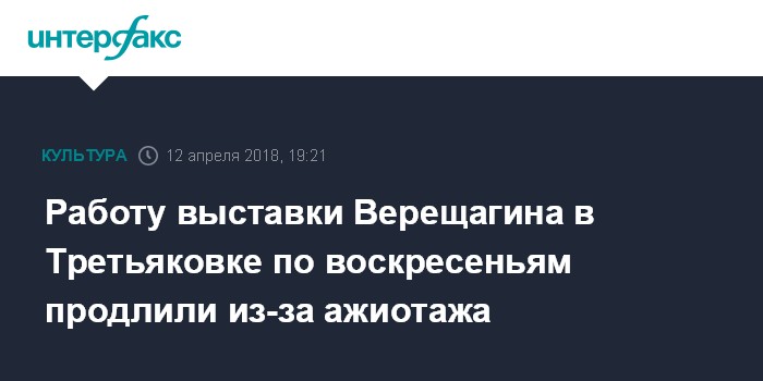 Москва. 12 апреля. INTERFAX.RU - Время работы Новой Третьяковки продлевают по воскресеньям в связи с повышенным интересом к выставке Василия Верещагина, которую за месяц посетили более 100 тыс. человек.