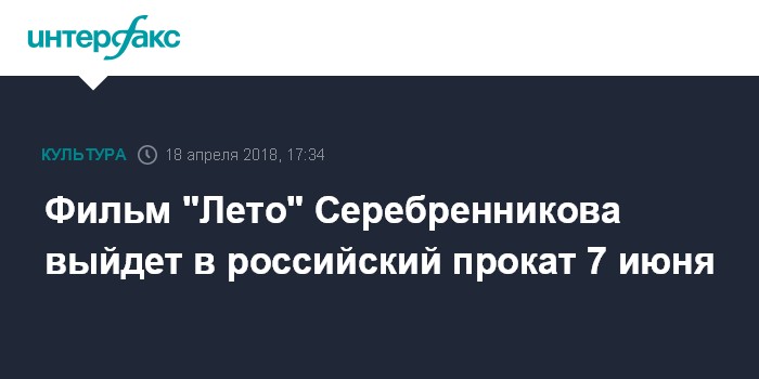 Москва. 18 апреля. INTERFAX.RU - Новый фильм режиссера Кирилла Серебренникова "Лето" выйдет в российский прокат 7 июня.
