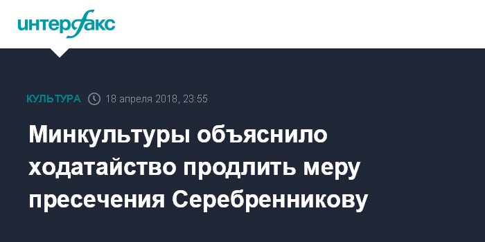 Москва. 18 апреля. INTERFAX.RU - В Минкультуры РФ объяснили ходатайство с просьбой продлить меры пресечения худруку "Гоголь-центра", режиссеру Кириллу Серебренникову и другим фигурантам дела "Седьмой студии" государственными интересами.