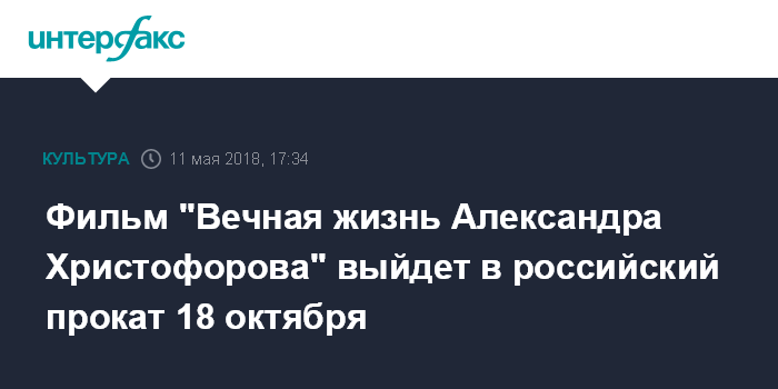 Москва. 11 мая. INTERFAX.RU - Фильм режиссера Евгения Шелякина "Вечная жизнь Александра Христофорова" выйдет в России в прокат 18 октября.