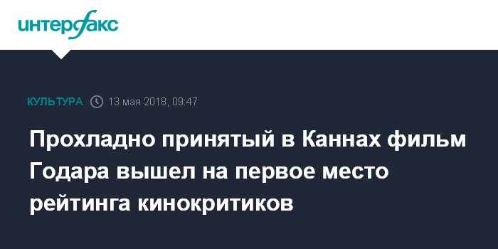 Москва. 13 мая. INTERFAX.RU - Новый фильм 87-летнего французского режиссера Жан-Люк Годара занял первое место рейтинга кинокритиков в Каннах, передает корреспондент "Интерфакса".
