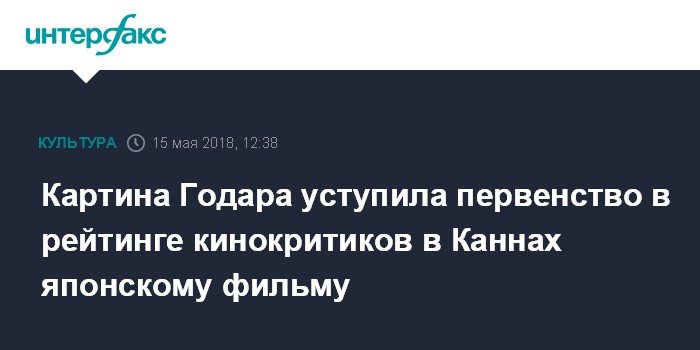 Москва. 15 мая. INTERFAX.RU - Японский фильм "Магазинные воришки" Хирокадзу Корээда сместил картину Жан-Люк Годара с первого места рейтинга кинокритиков основного конкурса 71-го Каннского кинофестиваля, передает корреспондент "Интерфакса".
