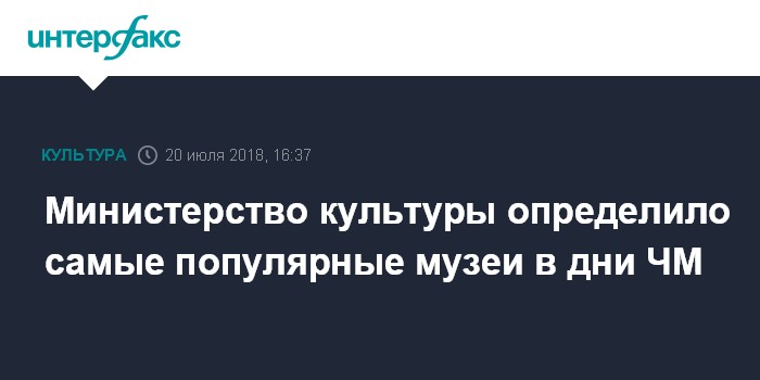 По данным Минкульта, с 13 июня по 16 июля 2018 года десять самых популярных музеев посетили около 2,7 млн человек. Список лидеров составили Государственный Эрмитаж, Государственный музей-заповедник "Царское село", Музеи Московского Кремля, Музей Победы, Владимиро-Суздальский музей-заповедник, Третьяковская галерея, Государственный исторический музей, Русский музей и Новгородский музей-заповедник.