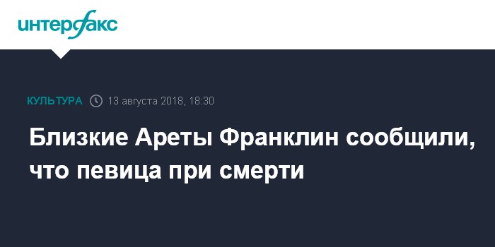 Москва. 13 августа. INTERFAX.RU - Знаменитая американская певица Арета Франклин при смерти, сообщил в своей колонке для Showbiz 411 журналист Роджер Фридман, который близко знает ее семью.