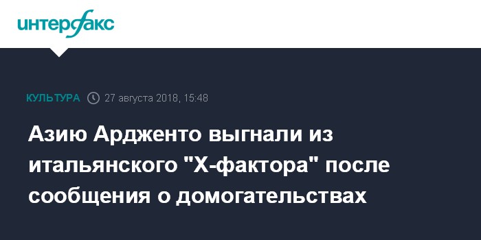 Москва. 27 августа. INTERFAX.RU - Актрису Азию Ардженто исключили из числа судей итальянского "X-фактора" из-за выдвинутых против нее обвинений в домогательствах, пишет The Hollywood Reporter.