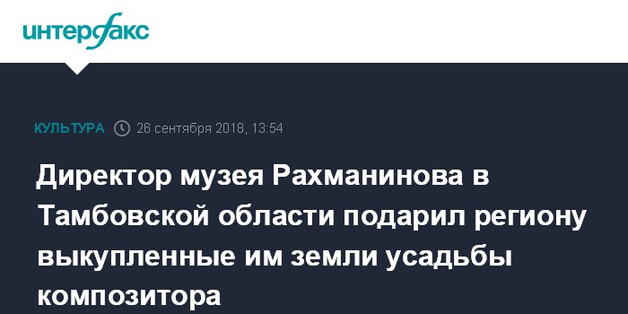 Москва. 26 сентября. INTERFAX.RU - Тамбовская область приняла в собственность земли, безвозмездно переданные региону директором музея-усадьбы композитора Сергея Рахманинова в Ивановке Александром Ермаковым, говорится в постановлении администрации региона.