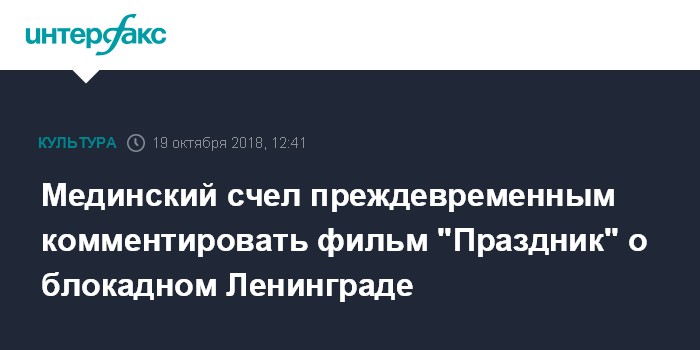 Москва. 19 октября. INTERFAX.RU - Министр культуры РФ Владимир Мединский заявил, что его ведомство примет решение по фильму "Праздник" про блокадный Ленинград только после поступления картины в министерство.