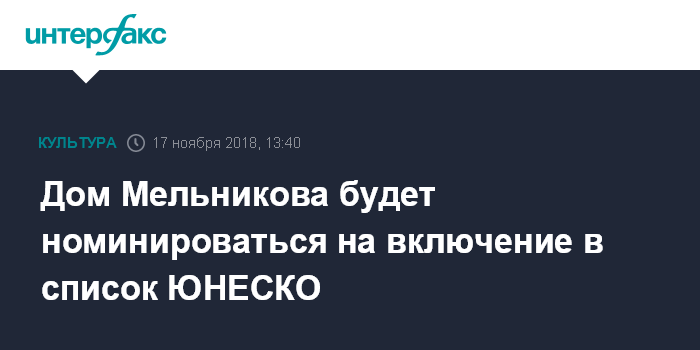 Москва. 17 ноября. INTERFAX.RU - Руководство Дома Мельникова намерено номинировать его на включение в список всемирного наследия ЮНЕСКО.
