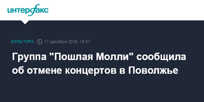 Москва. 11 декабря. INTERFAX.RU - Поп-панк-группа "Пошлая Молли" заявила об отмене запланированных на декабрь выступлений в нескольких городах Приволжского федерального округа.