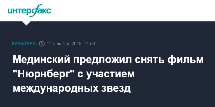 "Тема, требующая достоверного освещения в отечественном кино - Нюрнбергский процесс, чем, собственно, закончилась формально Вторая мировая. Тема эта сейчас исторически полностью приватизирована США. Во многих произведениях американцы пишут о Нюрнберге, как о своей большой победе, роль Советского Союза там фактически сводится на нет", - сказал Мединский, выступая на заседании оргкомитета "Победа", который провел в среду президент РФ Владимир Путин.