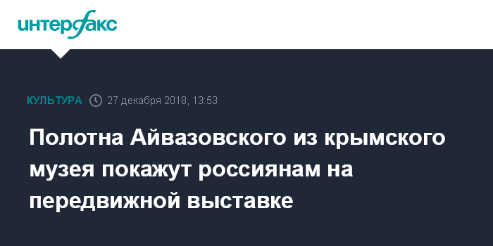 Москва. 27 декабря. INTERFAX.RU - Передвижная выставка работ известного художника-мариниста Ивана Айвазовского из коллекции Феодосийской картинной галереи пройдет по территории России в следующем году, сообщил глава Крыма Сергей Аксенов.