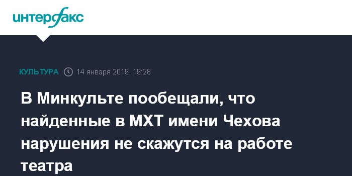 Москва. 14 января. INTERFAX.RU - Выявленные при проверке МХТ имени Чехова нарушения никак не скажутся на работе театра, заверили в пресс-службе Минкультуры РФ.
