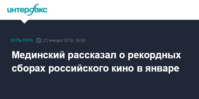 Москва. 21 января. INTERFAX.RU - Отечественные фильмы за первые три недели нового года собрали в российском прокате 5 млрд рублей или 70% всех потраченных на билеты денег, что является рекордным показателем за всю современную историю России, сообщил министр культуры Владимир Мединский.