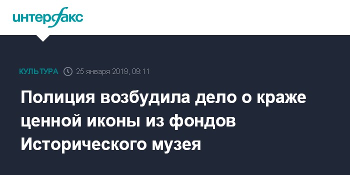 Москва. 25 января. INTERFAX.RU - Уголовное дело о краже возбуждено по факту пропажи иконы Богоматери Шуйской-Смоленской из фондохранилища Государственного исторического музея.