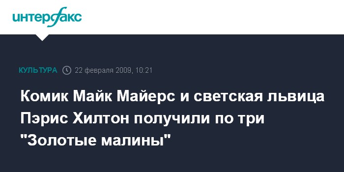 Киев. 22 февраля. INTERFAX.RU - В Лос-Анджелесе в субботу вечером были объявлены лауреаты ежегодной премии "Золотая малина", присуждаемой за самые сомнительные достижения в области кинематографии, сообщает британская телерадиокорпорация "Би-Би-Си".