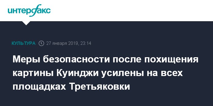 "Меры безопасности усилены на выставке Архипа Куинджи и на всех площадках Третьяковской галереи",- говорится в сообщении пресс-службы учреждения, распространенном в воскресенье.