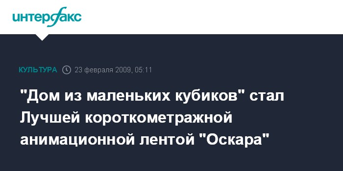 Москва. 23 февраля. INTERFAX.RU - "Оскар" в номинации Лучшая короткометражная анимационная лента получил мультфильм "Дом из маленьких кубиков".