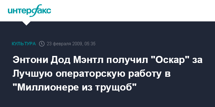 Москва. 23 февраля. INTERFAX.RU - "Оскар" за лучшую операторскую работу получил Энтони Дод Мэнтл, фильм "Миллионер из трущоб".