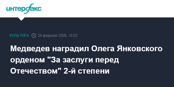 Медведев пожелал юбиляру здоровья, успехов и благополучия. Как сообщила в понедельник пресс-служба Кремля, своим указом Медведев "за выдающийся вклад в развитие отечественного театрального и кинематографического искусства" наградил О.Янковского орденом "За заслуги перед Отечеством" II степени.