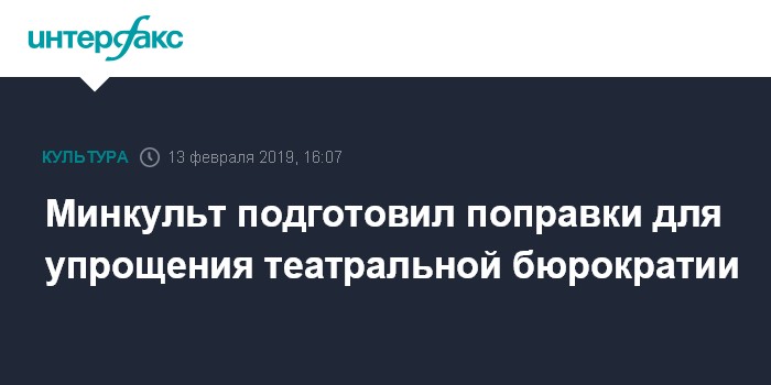 Москва. 13 февраля. INTERFAX.RU - Министерство культуры РФ разработало поправки в законы и нормативные акты ведомств, которые упростят театрам бюрократические процедуры при создании пьес и спектаклей.