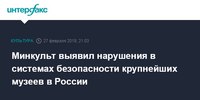 Москва. 27 февраля. INTERFAX.RU - Минкультуры РФ обнаружило нарушения в системах безопасности нескольких крупнейших музеев, они связаны с недоработками самих учреждений, а также подразделений Росгвардии.