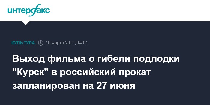 Москва. 18 марта. INTERFAX.RU - Прокатчик экшн-драмы про подлодку "Курск" планирует выпустить ее в прокат 27 июня, предварительные договоренности с Минкультуры РФ достигнуты.