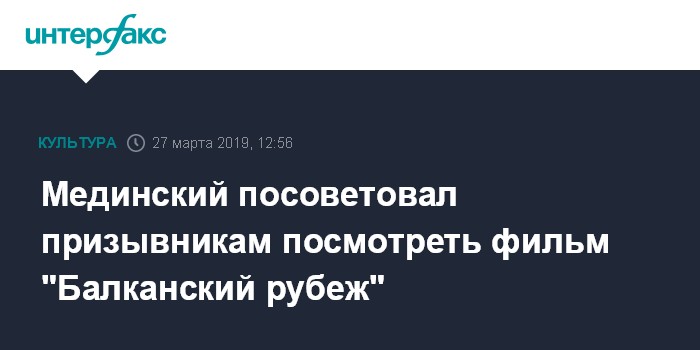 Москва. 27 марта. INTERFAX.RU - Министр культуры Владимир Мединский хотел, чтобы призывники сходили на фильм "Балканский рубеж".