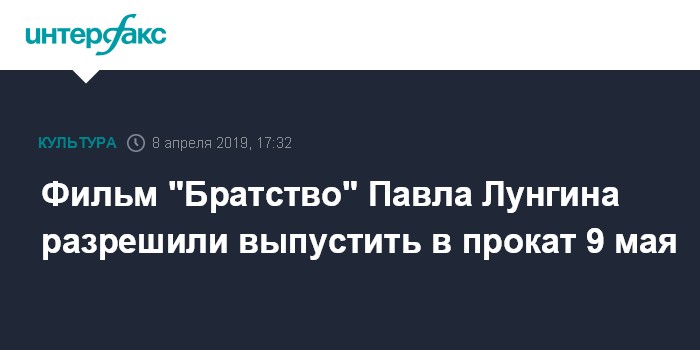 Москва. 8 апреля. INTERFAX.RU - Фильм "Братство" Павла Лунгина получил прокатное удостоверение и выйдет в кинотеатрах 9 мая, сообщили "Интерфаксу" в Минкультуры.