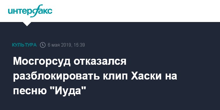 Москва. 6 мая. INTERFAX.RU - Мосгорсуд признал законным блокировку клипа рэпера Дмитрия Кузнецова (Хаски) на песню "Иуда", отказав его защите в удовлетворении апелляционной жалобы, сообщили "Интерфаксу" в пресс-службе суда в понедельник.