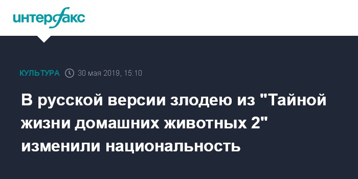 Москва. 30 мая. INTERFAX.RU - В русской версии мультфильма Universal Pictures "Тайная жизнь домашних животных 2" изменили национальность одного из персонажей - жестокого директора цирка, которого озвучил Ник Кролл. На это обратила внимание главный редактор издания "Киноафиша.инфо" Татьяна Шорохова.
