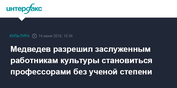 Москва. 14 июня. INTERFAX.RU - Правительство разрешило заслуженным работникам культуры получать ученое звание доцента или профессора в области искусства по научным специальностям, не имея ученой степени. Об этом говорится в постановлении за подписью премьер-министра Дмитрия Медведева, опубликованном на портале правовой информации.
