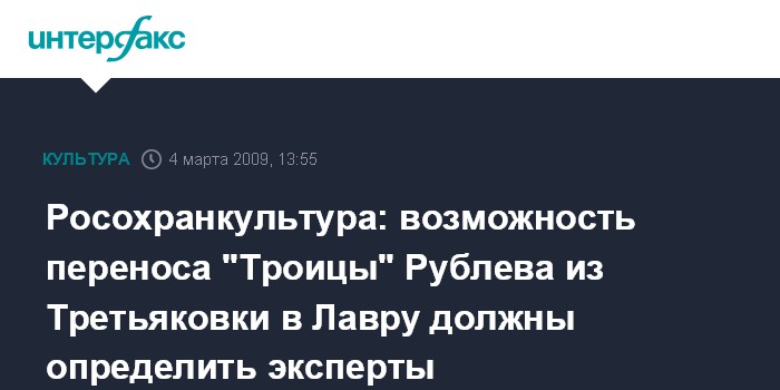 Москва. 4 марта. INTERFAX.RU – Глава Росохранкультуры Александр Кибовский считает, что икона "Троица" работы Андрея Рублева может быть перенесена из Третьяковской галереи в Троице-Сергиеву Лавру при условии обеспечения ее сохранности.