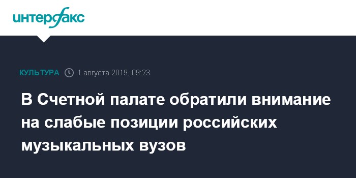 Москва. 1 августа. INTERFAX.RU - Российские музыкальные вузы не входят в международные рейтинги, обратили внимание в Счетной палате и предложили выделить меры господдержки, чтобы исправить эту ситуацию. Эту тему на коллегии Счетной палаты подняла аудитор ведомства Светлана Меркушина, ее слова приводятся в пресс-релизе палаты.
