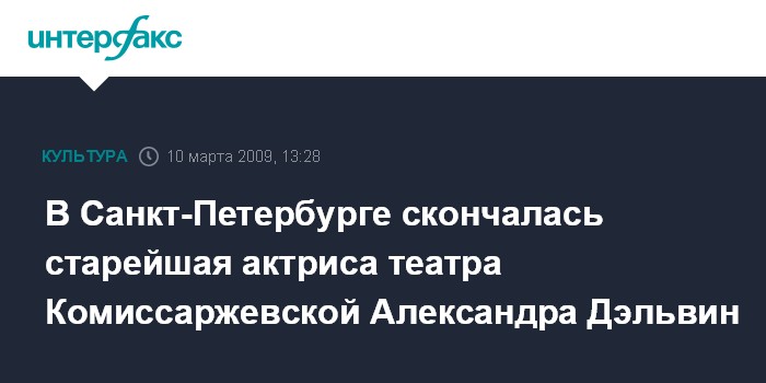 Москва. 10 марта. INTERFAX.RU - В Петербурге на 94-ом году жизни скончалась старейшая актриса театра имени Комиссаржевской Александра Дэльвин.