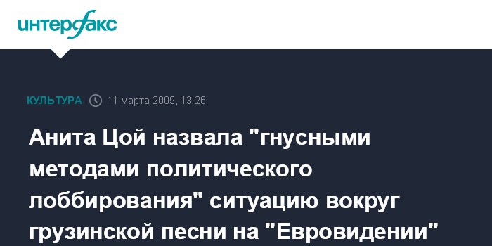Москва. 11 марта. INTERFAX.RU – Певица Анита Цой, участвовавшая в национальном отборе на конкурс "Евровидение-2005", заявила, что считает ситуацию вокруг грузинских участников "Евровидения-2009" и их песни следствием "гнусных методов политического лоббирования". Она подчеркнула, что полностью согласна с позицией Дианы Гурцкой, которая считает недопустимым для музыкантов выходить на конкурс с песней, которая может задеть чьи-либо чувства или стать причиной конфликта.