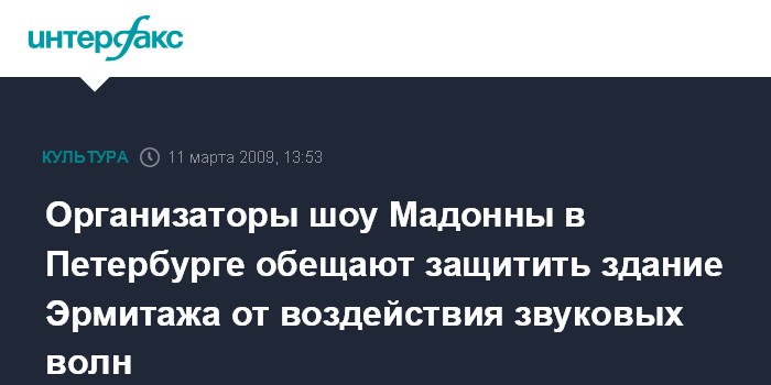 Москва. 11 марта. INTERFAX.RU - Корпорация PMI, выступающая организатором концерта Мадонны 2 августа в Санкт-Петербурге, обещает соблюсти все требования по безопасности Эрмитажа и окружающих Дворцовую площадь памятников.