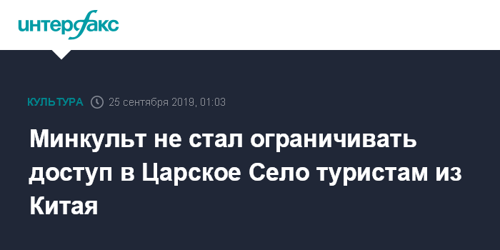 "Минкультуры России категорически возражает против появившихся заголовков и статей в СМИ, согласно которым ведомство якобы "хочет ограничить число китайских туристов в "Царском селе"... Ни в коем случае речь не идет об ограничении доступа в музей для китайских туристов. Напротив, было подчеркнуто, что китайские туристы, представляющими страну - стратегический партнер РФ являются желанными гостями в музее. Именно поэтому нужно сделать все, чтобы и российские туристы имели доступ к собственному культурному наследию, и гости из Китая не стояли в очереди, время ожидания в которой на сегодняшний день составляет до 4 часов", - говорится в сообщении ведомства.