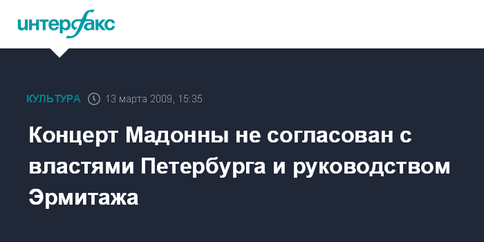 Санкт-Петербург. 13 марта. INTERFAX.RU - Проведение концерта Мадонны 2 августа на Дворцовой площади пока не согласовано ни с директором Эрмитажа Михаилом Пиотровским, ни с руководством комитета по культуре Петербурга, сообщает пресс-служба ведомства.