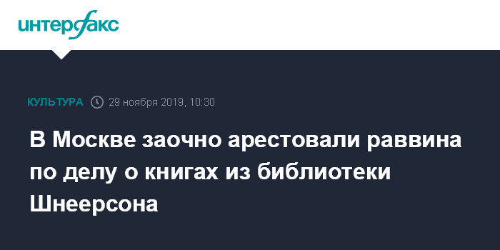 Москва. 29 ноября. INTERFAX.RU - Тверской суд Москвы заочно арестовал директора американской библиотеки "Агудас Хасидей Хабад" Шолома Дов-Бер Левина по обвинению в невозврате России семи книг из библиотеки Шнеерсона, пишет "Коммерсантъ".