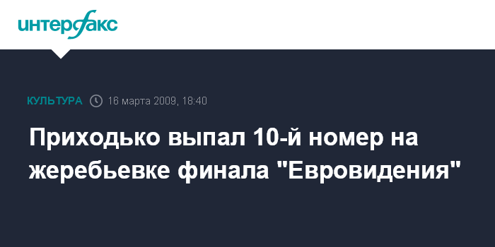 Москва. 16 марта. INTERFAX.RU - Певица Анастасия Приходько, которая будет представлять Россию на "Евровидении-2009", выйдет в финале на сцену десятой из 25-и участников финала.