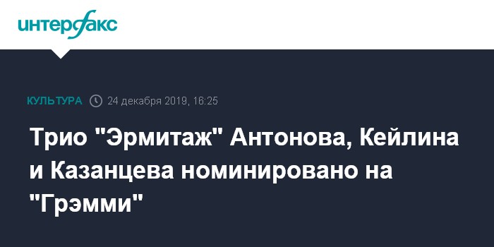 Москва. 24 декабря. INTERFAX.RU - Российские музыканты Сергей Антонов (виолончель), Миша Кейлин (скрипка) и Илья Казанцев (фортепиано) в составе фортепьянного трио "Эрмитаж" (Hermitage Piano Triо) стали номинантами 62-й премии "Грэмми" (Grammy Awardes).