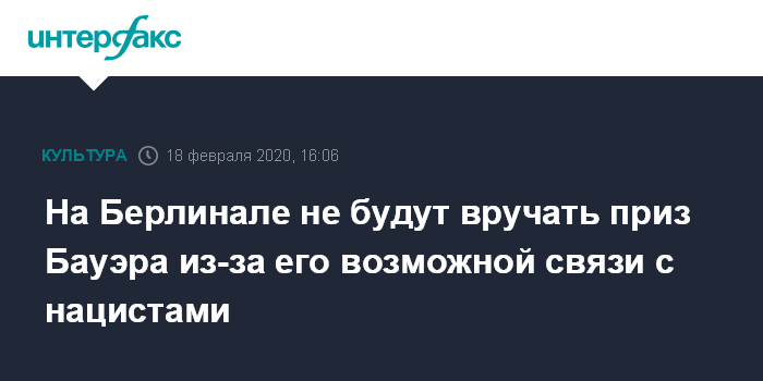 Москва. 18 февраля. INTERFAX.RU - Организаторы Берлинского кинофестиваля приостановили до установления причастности первого директора Берлинале Альфреда Бауэра к нацистскому режиму вручение названного в честь него приза.