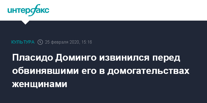 Москва. 25 февраля. INTERFAX.RU - Испанский оперный певец Пласидо Доминго попросил прощения за принесенные страдания у женщин, которые обвинили его в сексуальных домогательствах.