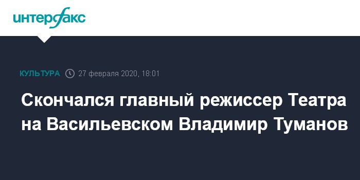 Москва. 27 февраля. INTERFAX.RU - Театр на Васильевском (Санкт-Петербург) в четверг сообщил о кончине главного режиссера Владимира Туманова.