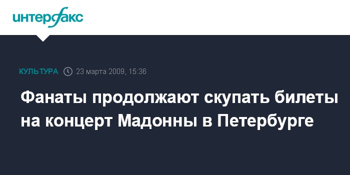 Санкт-Петербург. 23 марта. INTERFAX.RU - Поклонники творчества Мадонны продолжают активно скупать билеты на концерт поп-певицы 2 августа в Петербурге, сообщили "Интерфаксу" в понедельник в пресс-службе корпорации, выступающей организатором мероприятия.
