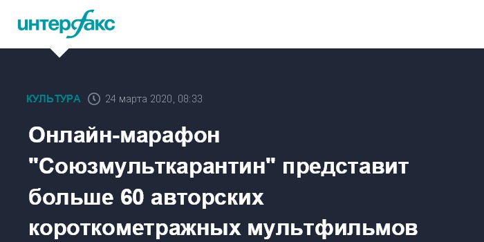 Москва. 24 марта. INTERFAX.RU - В рамках онлайн-марафона авторского короткометражного кино "Союзмульткарантин" киностудия "Союзмультфильм" представит около 60 таких фильмов, сообщили в пресс-службе компании.