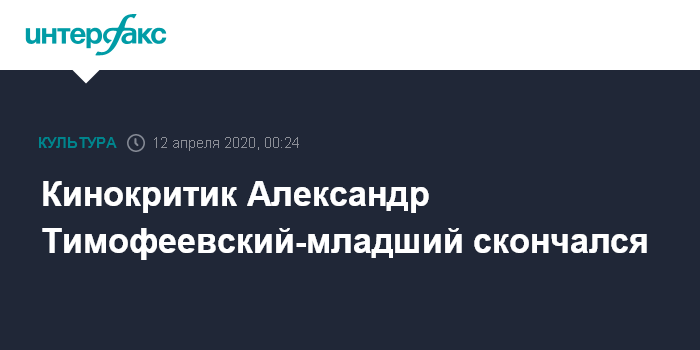 Москва. 12 апреля. INTERFAX.RU - Литератор и кинокритик Александр Тимофеевский-младший скончался, сообщила писательница Татьяна Толстая.