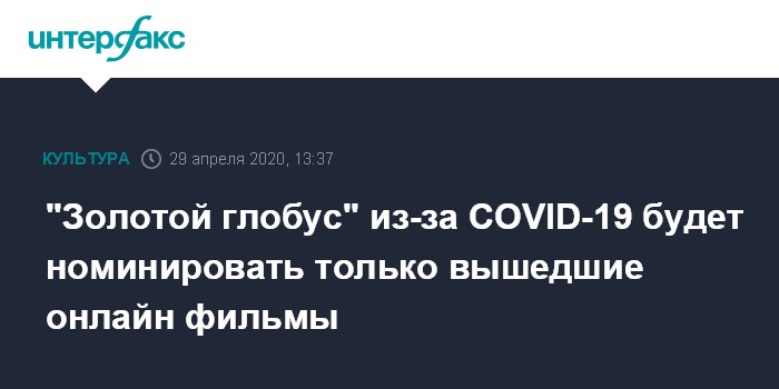 Москва. 29 апреля. INTERFAX.RU - Голливудская ассоциация иностранной прессы (HFPA) изменила правила отбора картин, претендующих на "Золотой глобус", из-за пандемии коронавируса, впервые к участию будут допущены фильмы, которые показывались только онлайн, а не в кинотеатрах.
